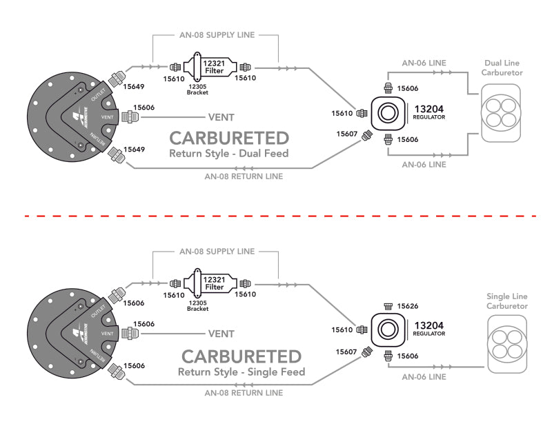 These new Phantom Carbureted Fuel Systems include all main fuel system components required to create a proper carbureted fuel system, including the desired Phantom Baffled Fuel Pump Kit with a 340 LPH fuel pump.? Each system ships with the proper carbureted bypass fuel pressure regulator, high flow billet fuel filter, filter mounting bracket, plus all the required port fittings and o-rings, the deluxe wiring kit (not shown) and Aeromotive fuel pressure gauge. Ideal for naturally aspirated and blown, carbureted engines producing up to 900 plus flywheel Horse Power, on the street or at the track.? AN-08 Style fuel hose and hose-ends are required for the installation of a fuel supply and return line, sold separately and not included. This kit contains the following parts: 1ea p/n 18688 Phantom 340, 1ea p/n 12321 Filter 10 micron Paper, 1ea p/n 12305 Filter Bracket, 1ea p/n 13204 Regulator, Bypass, Carb., 1ea p/n 16307 Fuel Pump Wiring Kit, 3 ea p/n 15606 AN-06 ORB to AN-06 flare, 1 ea p/n 15607 AN-08 ORB to AN-08 flare, 3 ea p/n 15610 AN-10 ORB to AN-08 flare, 1ea p/n 15626 AN-06 Port Plug, 2ea p/n 15649 AN-06 ORB to AN-08 flare, 1 ea p/n 15632 0-15 PSI Pressure Gauge.