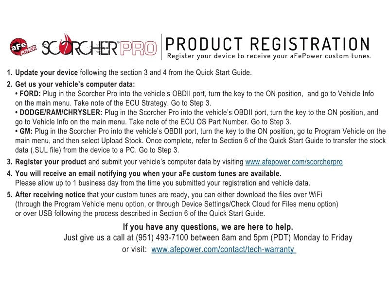 If you are looking to maximize your vehicle’s performance potential and drivability with a simple download, the aFe SCORCHER PRO Performance Programmer with aFe POWER’s custom tunes is for you. The SCORCHER PRO Performance Programmer is an all-in-one, performance programmer that provides specially calibrated tunes for vehicles equipped with aFe POWER products* delivering more horsepower and torque when you need it. With cloud-based tune delivery and built in Wi-Fi capability, you can download aFe POWER’s custom tunes whenever or wherever you want it. With its data logging monitoring capabilities, you can display critical vehicle data using full color on-screen, customizable gauges. It's the ultimate in performance enhancements in that it is tailored to fit your vehicles specific modifications and ECU to perform perfectly and produce maximum power gains. The SCORCHER PRO Performance Programmer does not support any changes to your vehicle’s emission system. All-in-one, performance programmer that provides specially calibrated tunes for vehicles equipped with aFe POWER products* to maximize your vehicles performance potential and drivability with a simple download. It's the ultimate in performance enhancements. Customized tunes to reprogram your vehicle’s ECU to perform perfectly and produce maximum horsepower with aFe POWER products.